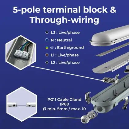 Un élément important des réglettes LED à prendre en compte est la valeur IP. Elle indique dans quelle mesure un produit est étanche à la poussière et à l'eau. L'indice IP44 signifie qu'un appareil est étanche aux éclaboussures et à partir de l'indice IP65, un luminaire LED est totalement étanche à la poussière et à l'eau. La valeur IP de cette réglette LED est : IP65 – Résistant à la poussière et à l'eau (jets d'eau). Si une réglette LED est totalement étanche, vous pouvez parfaitement l'utiliser dans des endroits où elle risque d'être mouillée, comme les écuries, les hangars, les sous-sols, les parkings et les espaces extérieurs.
