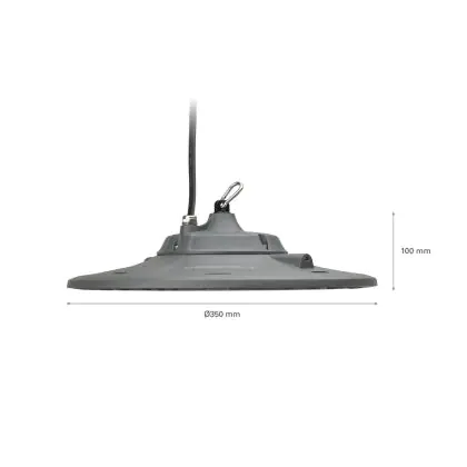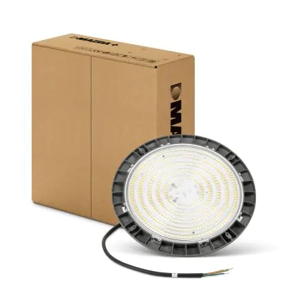 Cet high bay a une IP de IP65 – Résistant à la poussière et à l'eau (jets d'eau) et un IK de IK07 - 2 Joule.