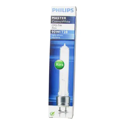 De Philips CosmoWhite CPO-TW Xtra lampen zijn heldere buisvormige keramische metaalhalogeenlampen welke een wit licht uitstralen. Ze hebben een zeer goede spreiding van het licht waardoor de armaturen verder uit elkaar geplaatst kunnen worden. De Philips CosmoWhite CPO-TW Xtra 90W 728 PGZ12 (MASTER) is een 90W gasontladingslamp met een PGZ12 lampvoet. De lampvoet maakt het zeer gemakkelijk om uw lamp te vervangen. U kunt de lamp eenvoudig in het armatuur bevestigen.