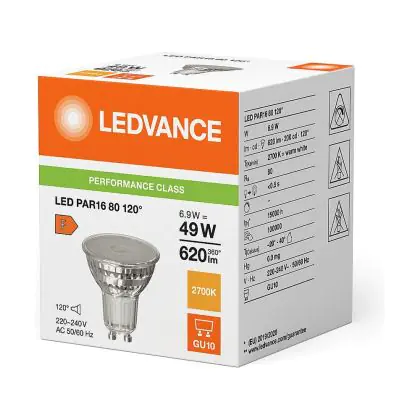Beschrijving Voordeelpak 10x Ledvance Performance LED Spot Reflector GU10 PAR16 6.9W 620lm 120D - 827 Zeer Warm Wit | Vervangt 80W
